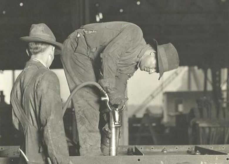 Обратите внимание на фотоснимки прошлого – кругом клёпки, например, на понтоне (Египет, фото выше), на трубопроводе (США, фото ниже). Их тысячи, а то и миллионы, все эти клёпки отличаются идеальным размером и, главное, идеальным прилеганием к металлической поверхности. Сегодня подобное соединение можно достичь только с помощью клепанного пресса с ЧПУ. Но у него есть серьезный недостаток – трудоемкость и высокая себестоимость такого процесса, везде и всюду его не применишь. Не говоря уже о серьезной вибрации и шумности…