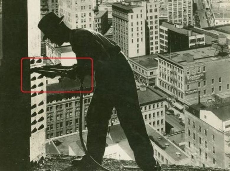 Каким же образом в далеком прошлом люди легко и просто ставили клёпки практически где угодно? Обратите внимание на старые снимки (заметим, их очень мало, подчистка истории прошла тотальная), где зафиксирован момент работы клепальщика. Он использует какой-то инструмент, к которому подходит то ли провод, то ли бронешланг. Судя по всему, это приспособление и расплавляло клёпку, намертво сажая ее в отверстие соединения. Самому клепальщику при этом не нужен был ни помощник, ни великие затраты сил и времени на такую работу (повторимся, клёпки ставились также легко, как гвозди в дерево).