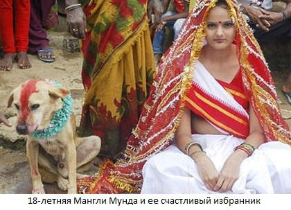 За собаку можно не только выйти замуж, но и жениться на ней. В 18-летнем возрасте индиец Селва Кумар убил пару дворняг, после чего бедолагу разбил паралич. После 15 лет лечений и мучений он обратился к астрологу, который увидел на нем «собачье проклятие», снять которое можно лишь искупительной жертвой – жениться на собаке. 33-летний паралитик был готов на все и в тот же день взял в законные жены первую попавшуюся на глаза дворняжку. Так что если не хотите подобной судьбы – не обижайте братьев наших меньших!
