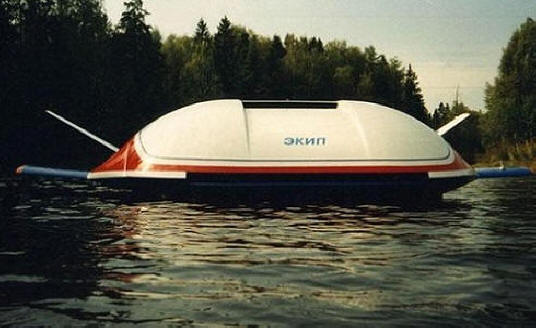 А вот советская разработка 1981 года, экранолет – летающее крыло на воздушной подушке. Высота полета от 3 до 11.000м, скорость от 120 до 700км/ч. Аэродром не требуется, садится на любую ровную поверхность (поле, пашня), и даже на воду.