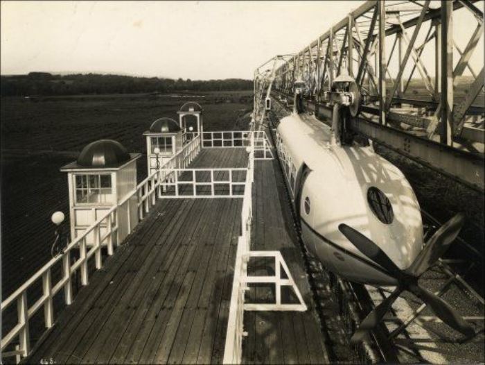 Так называемый «рельсовый самолет» был создан Джорджем Бенни в конце 20-х годов прошлого столетия. Машина использовала двигатели и несколько пропеллеров, благодаря которым разгонялась до 190 км/ч. К несчастью, Бенни очень быстро обанкротился и совсем скоро о необычном проекте и вовсе забыли.