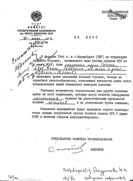В 1970 году территория занимаемого советскими войсками военного городка в Магдебурге передавалась властям ГДР. Снова всплыл вопрос об останках фюрера и захороненных с ним (всего 10 трупов). В марте 1970 года Председатель КГБ Андропов направил Брежневу записку, в которой предлагал могилу вскрыть, останки уничтожить путем сожжения. Свои утвердительные визы на документе кроме Брежнева оставили Косыгин и Подгорный. Операция по уничтожению останков получила наименование «Архив».