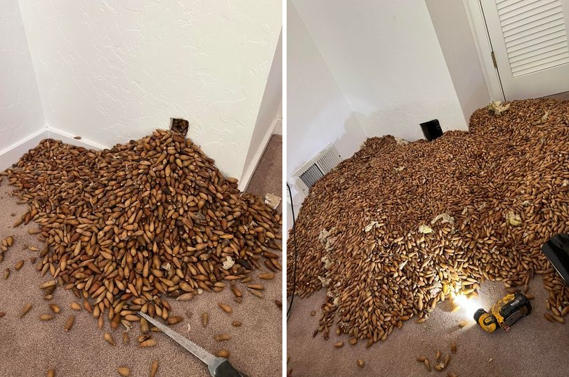Как только специалисты по борьбе с вредителями начали прорезать отверстия во внутренних стенах дома, оттуда посыпались горы желудей, и чем больше отверстий они вырезали, тем больше желудей они находили. В конце концов, они наполнили восемь больших мешков для мусора - примерно 300 килограммов желудей.
