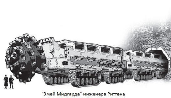 Более удачной была судьба у проекта инженера Риттена. Независимо от Верна он в 1934 году разработал свой вариант подземохода, назвав его «Змей Мидгарда», планируя машину в первую очередь для штурма французской Линии Мажино. Проект Риттена поражал масштабностью. «Змей» представлял собой целый поезд в 500м из отсеков размером 7м в длину, 6м в ширину и 3,5м в высоту со спальней на 30 человек, тремя ремонтными мастерскими, радиостанцией, кухней и спасательной шлюпкой для выхода на поверхность.