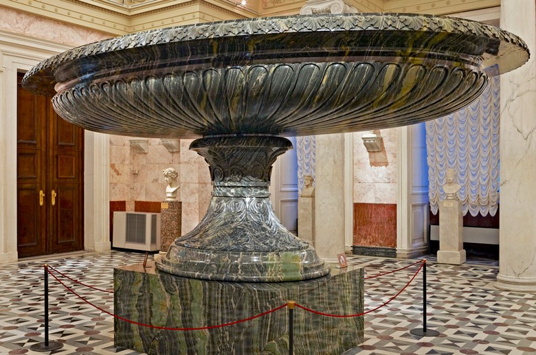 В Эрмитаже, что находится в Санкт-Петербурге, находится удивительная по красоте Большая Колыванская ваза, которую в народе чаще называют Царицей ваз. Объясняется это очень просто: перед вами настоящий шедевр камнерезного искусства первой половины XIX века, поскольку выполнена ваза из огромной глыбы красивейшего камня яшмы с очень интересными зеленовато-волнистыми узорами-прожилками.