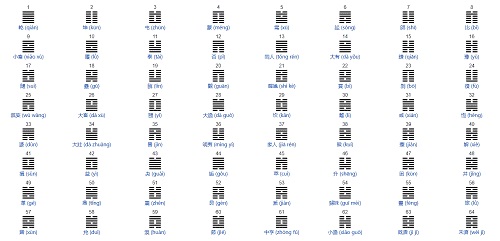 Один тип - это целые горизонтальные линии, называемые ян. Другой-горизонтальный штрих, прерывающийся посередине, называемый «инь». Каждый значок (гексаграмма) имеет шесть таких функций, расположенных в различных комбинациях.