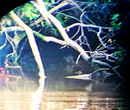 Однажды вечером мы были на веранде и глазели на окрестности вокруг. Прилив был отливным, и вы могли хорошо видеть берег реки и лес. И мы увидели, как нечто, которое находилось примерно в 25 метрах от нас, наклонилось возле воды, словно собиралось пить.