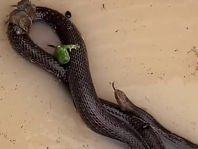 Маленькие животные прокатились на большой черной змее, оказавшись в ловушке в резервуаре для дождевой воды в Квинсленде, который был затоплен после сильного дождя.