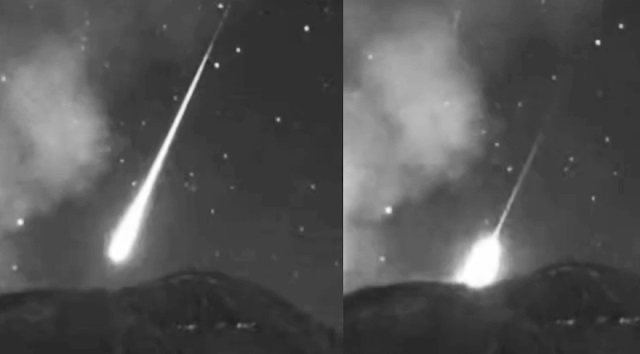 На представленном видеоролике видно, как неизвестный яркий объект, похожий на падающий метеорит, предположительно влетает в жерло активного вулкана.