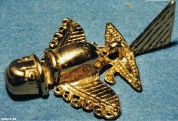 В эту теорию органично укладываются найденные в Колумбии золотые фигурки индейцев толима, внешне очень напоминающие самолеты. Индейцы действительно видели летательные аппараты и пытались воссоздать их внешний облик. Конечно, настоящие самолеты не имели ни столь устрашающих крокодильих голов, ни затейливых узоров на корпусах. Это индейцы, изготовляя фигурки, внесли в них элементы своей культуры. Но общая конфигурация аппаратов передана довольно точно.