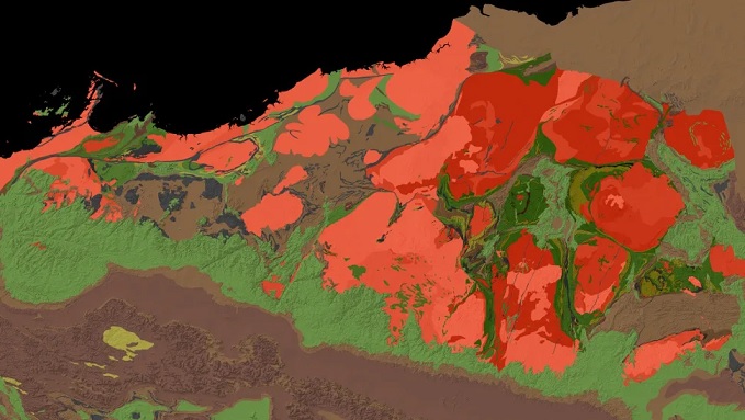 420-километровый участок кратона Пилбара; зеленым выделены участки древних базальтов / ©Alec Brenner, Harvard University, GSWA