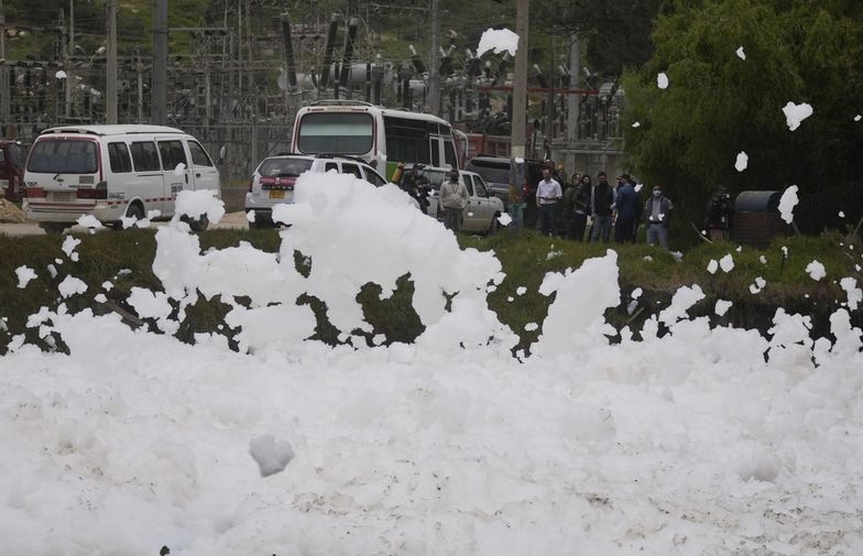 Огромный слой токсичной пены попал из загрязненной реки в колумбийский город Москера. Пена разбилась на облачные куски и дрейфует с ветром вдоль улиц.