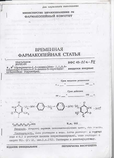 В 1993 году лабаратория добилась от Госинспекции по лекарственным средствам разрешения для лаборатории выпускать диуцифон. Это называлось «опытно-экспериментальное производство». Поставляли в том числе в обычные аптеки. В пенициллиновых упаковках по 200 миллиграммов. Лабаратория утвердила в фармакопейном комитете так называемую фармакопейную статью на диуцифон. Это «паспорт» на лекарство – утвержденная формула, перечень показателей качества.