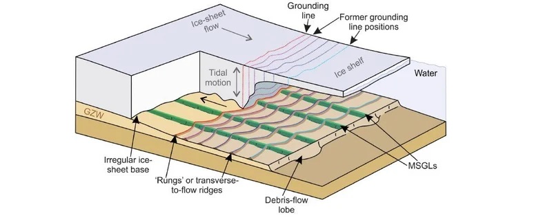 Гребни высотой менее 1,5 метра и находящиеся на расстоянии примерно 20−25 метров друг от друга — это следы плавающих льдин, поднимаемых и опускающихся в осадок приливами и отливами. Проведя эти измерения и сделав расчет, ученые поняли, что каждый день льды отступают на 40−50 метров меньше льда. Это составляет около 18 километров в год.