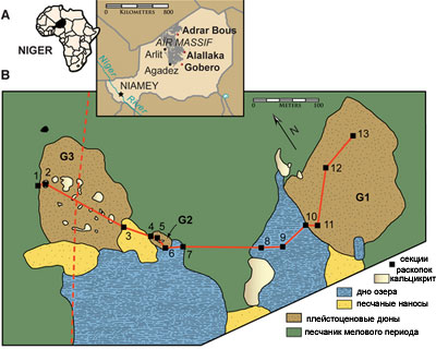 В Нигер, в район Гоберо, учёные впервые вернулись в 2003 году и за прошедшие пять лет отыскали около 200 могил каменного века, расположенных на двух древних дюнах, около сотни метров в поперечнике каждая; дюны находятся всего в паре сотен метров друг от друга. Примерно треть этих могил — если быть точным, 67 штук — учёные успели детально исследовать. Именно результаты изучения этих 67 захоронений и многочисленных костей и артефактов, найденных как в этих могилах, так и в их окрестностях, и составляют содержание статьи, опубликованной в PLoS ONE.