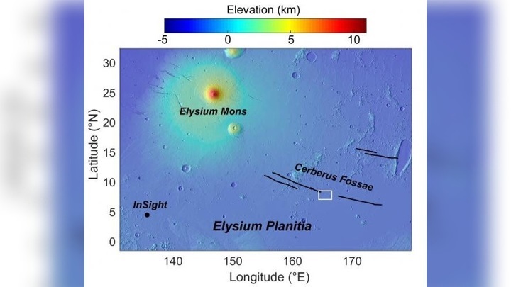 Карта равнины Элизий. Цветами обозначена высота. Место предполагаемого извержения обведено белым прямоугольником.