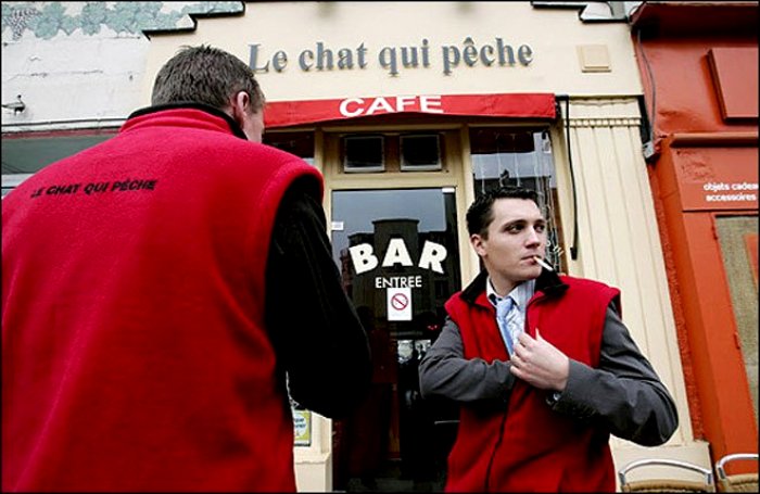Французское заведение «Кот на рыбалке» не был бы чем-то примечательным, если бы его владельцы не придумали оригинальную идею, как сэкономить на оборудование теплого помещения для курящих, и при этом не ущемить последних в праве затянуться, когда они этого хотят. Так, любители взять в руки сигаретку получают от персонала ресторана ярко-красные спасательные жилеты с эмблемой заведения и идут курить на улицу. Самое поразительное, что эта фишка настолько пришлась по душе всем клиентам, что даже те, кто не имеют привычки курить, с удовольствием обращаются к этому оригинальному предмету одежды, надевая их для времяпрепровождения за чашечкой чая или кофе на свежем воздухе.
