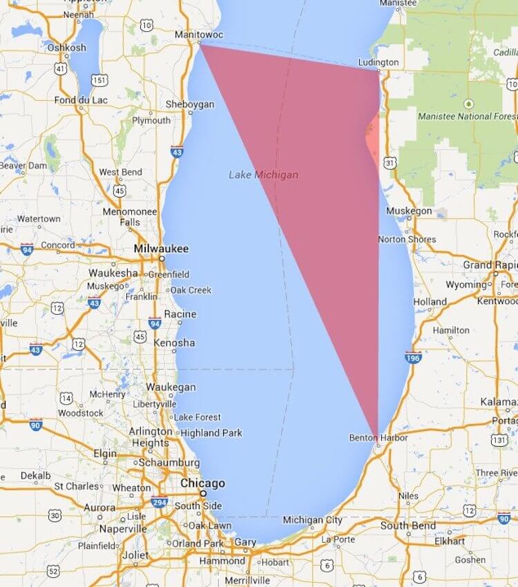 Свое название это место получило, как и большинство аномальных зон, по имени места, где оно расположено. Мичиганский треугольник находится в центре озера Мичиган — самого большого американского озера. Его размер действительно впечатляют. Он составляет 517 на 190 километров, а площадь — 58 016 квадратных километров. Береговая линия протянулась на 2 656 километров и проходит по территории четырех штатов. Это четвертое по размеру пресноводное озеро в мире.