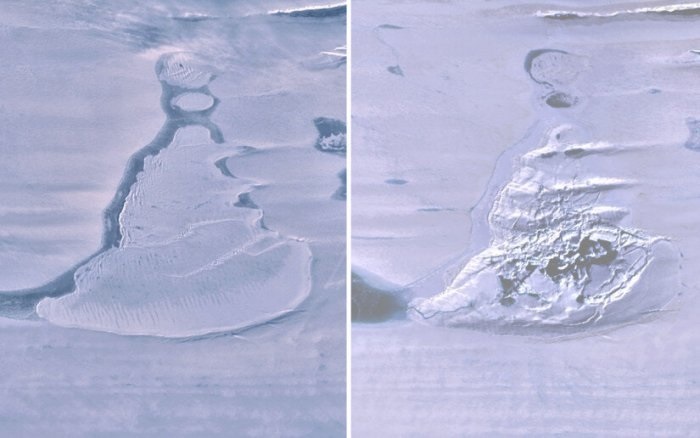 По оценке авторов исследования, ледяная поверхность на месте бывшего водоема опустилась на 80 метров, а плавучий ледник благодаря этому поднялся почти на 36 метров.