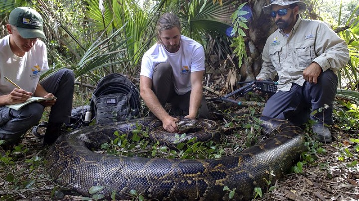 По словам официальных лиц США, команда биологов недавно вытащила самого крупного и тяжелого бирманского питона, когда-либо пойманного во Флориде.