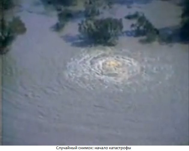 На глазах жителей и работников буровой воронка стремительно увеличивалась в размерах и скоро достигла 55 метров в диаметре. Огромной силы поток за несколько минут размыл остров с ботаническим садом, к центру воронки неслись баржи, буксир, лодки, деревья, автомобили, беседки. Пожилой мужчина с племянником, рыбачившие в этот ранний час на лодке, изо всех сил работали веслами. (Забегая вперед скажем – они остались живы.)