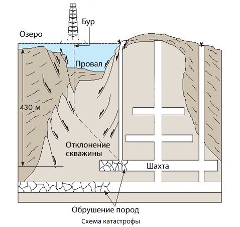 Как выяснилось позднее, бур нефтяников пробил потолок. 35-сантиметровое отверстие стремительно увеличивалось в размерах. Пресная вода быстро растворяла оставленные соляные столбы, поддерживавшие свод и он рухнул.