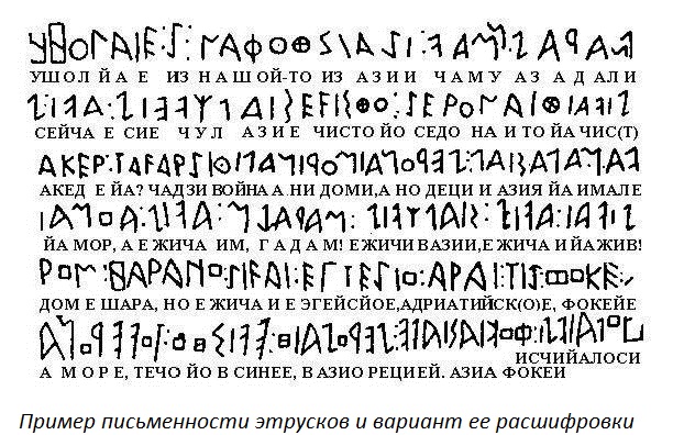 Но ученые только разводят руками: прочитаны записи шумеров, расшифрованы египетские иероглифы, но этруские письмена оказались настолько крепким орешком, что вошли в итальянский фольклор: столкнувшись с проблемой, которую он не в силах решить, итальянец в сердцах произносит: «etruscum non legitur!» (Этруское не читается!). Читается, и еще как!