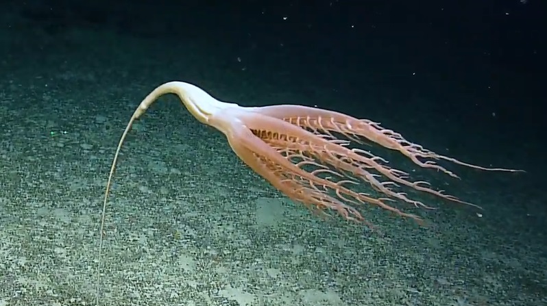 Камеры засняли «морскую ручку», прикрепленную к океанскому дну с 40-сантиметровыми щупальцами, вытекающими из ее двухметрового стебля.