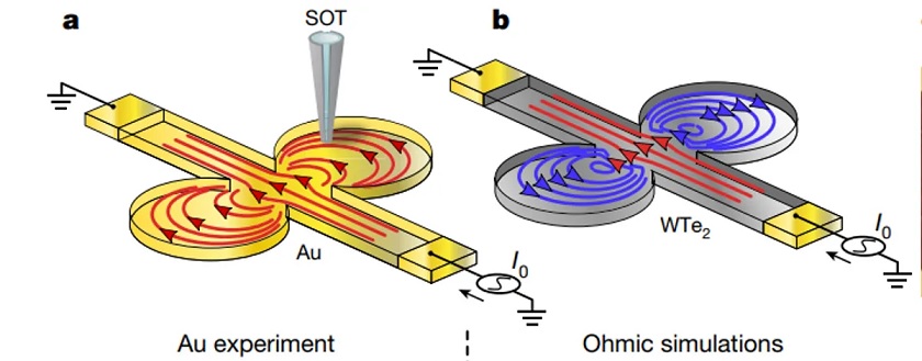 Фото из открытых источников / В дителлуриде вольфрама электроны, текущие в боковые каналы, образуют водовороты, но этого не происходит в золоте. Фото: Aharon-Steinberg et al / Nature
