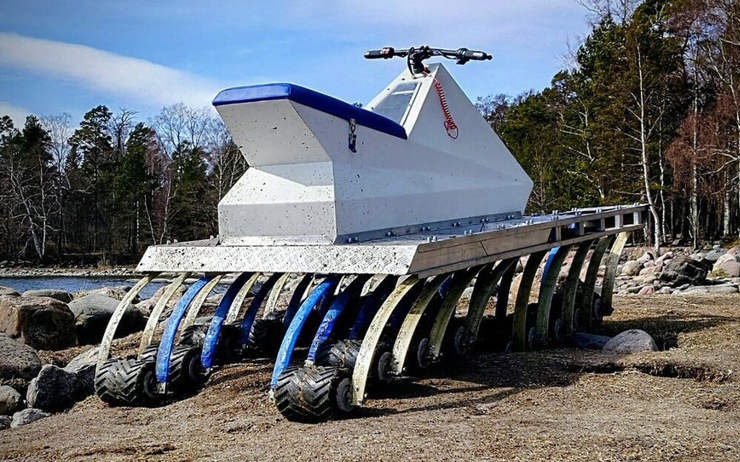 Дизайн в стиле многоножки вездехода 18Wheels Inc. не похож ни на что из того, что мы когда-либо видели. По сути, он состоит из кузова, похожего на снегоход, и набора из 18 маленьких колес, каждое со своей индивидуальной системой подвески. Одной из основных идей проекта - сделать транспортное средство экологически чистым, поэтому колеса специально сделаны маленькими, чтобы они не повреждали почву. Уникальная система подвески обеспечивает особую траекторию движения и гораздо более плавную езду по всем типам пересеченной местности, чего нельзя сказать о традиционных квадроциклах.