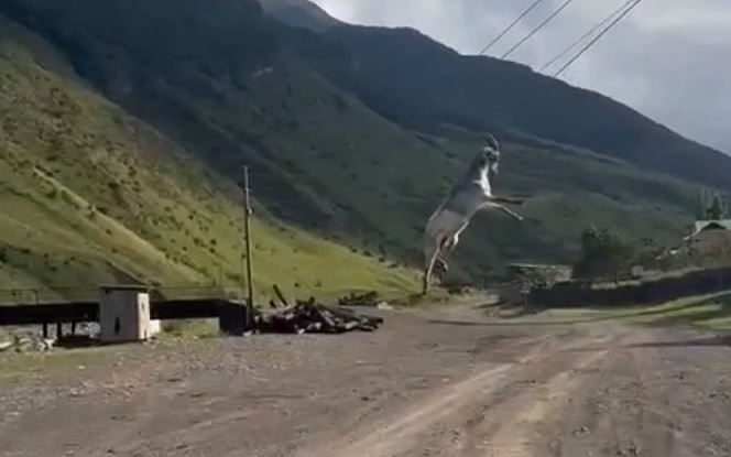 Козел-экстремал из Дагестана зацепился рогами за провода и повис