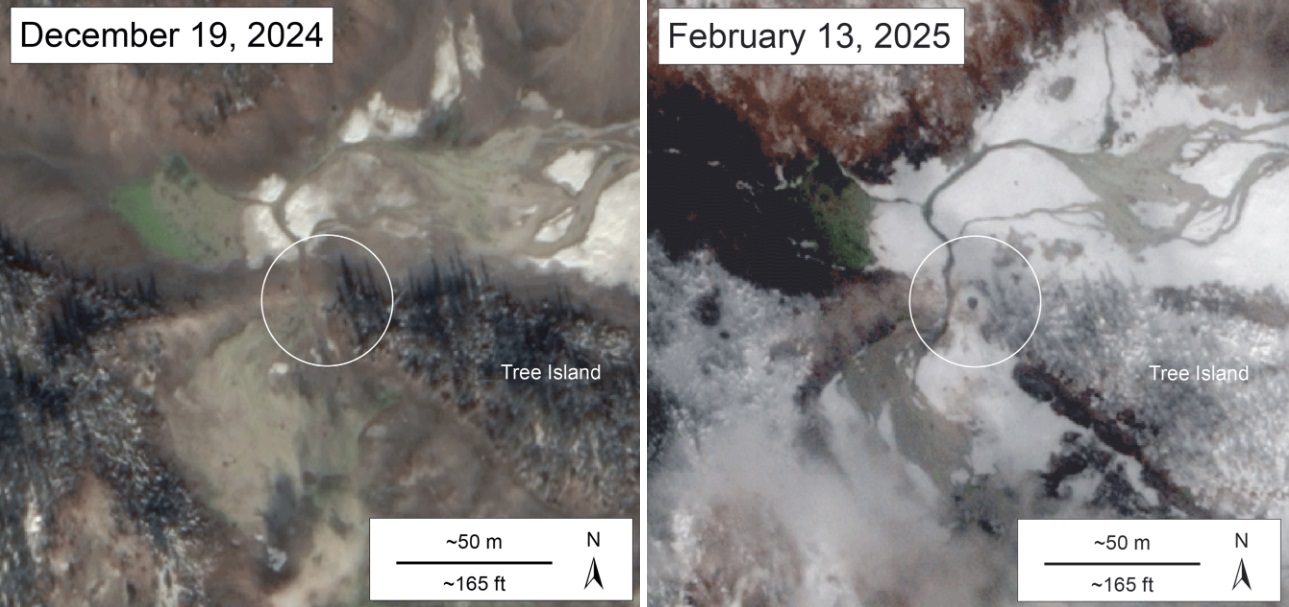 Исследователи пришли к выводу, что эти изменения связаны с гидротермальной активностью. Анализ спутниковых снимков показал, что в декабре 2024 года воронка отсутствовала, но к началу января 2025-го появилась небольшая впадина, которая к середине февраля превратилась в заполненный водой бассейн.
