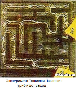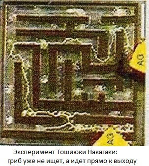 Японский биолог у входа в небольшой лабиринт положил плесневелый гриб, а у выхода – кусочек сахара. В поисках пищи гриб выпустил нити. «Ощупав» ими каждый закоулок лабиринта, гриб к вечеру добрался до сладкого. Затем отросток гриба положили у входа в такой же лабиринт. Гриб уже не стал изучать весь лабиринт, а выпустил одну нитку и кратчайшим путем двинулся прямо к точке, где его ждал «десерт».
