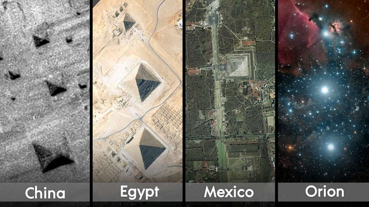 «То, что вверху, похоже на то, что внизу», этот принцип иллюстрируется египетскими пирамидами, которые являются земными копиями, трехмерной картой, имитацией самых ярких звезд в Орионе. И не только эти сооружения. Две пирамиды Теотиуакана, наряду с храмом Кецалькоатля, расположены таким же образом.