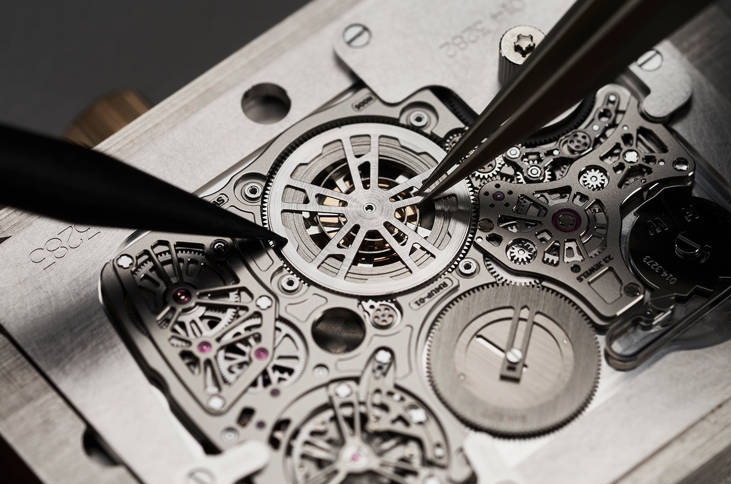 Richard Mille утверждает, что на разработку самых тонких в мире новых механических наручных часов ушло более 6000 человеко-часов, в том числе на создание титанового балансира, уникального спускового механизма и предохранительного ролика для передачи энергии на балансир.