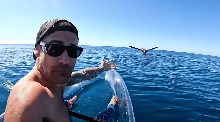 Это произошло, когда Мосс перемещался в прозрачном каяке. Он описывает момент, когда хвост гигантского горбуна прорвал поверхность океана перед ним, и его сердце начало биться быстрее. Мосс удивленно указывает на рифленый хвост кита, который неподвижно возвышается над водой.