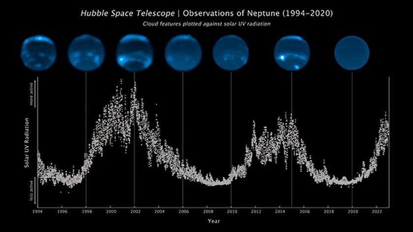 Согласно данным исследования, связь между солнечным циклом и облаками прослеживается в течение 2,5 циклов облачной активности, зафиксированных за почти 30 лет наблюдений за Нептуном. Планета пережила изменения от ярких максимумов в 2002 году до тусклых минимумов в 2007 году, затем снова засияла в 2015 году, и снова потемнела до самого низкого уровня в 2020 году - наиболее тёмного уровня, когда-либо зарегистрированного.