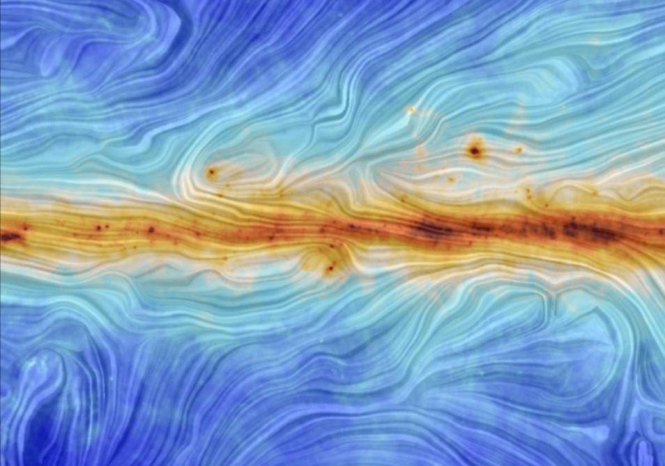 Фото из открытых источников / Пыль в Млечном Пути, представлена более тёмными и красными цветами, — это области, где происходит формирование новых звёзд. Эти пылевые области связаны с магнитными полями, присутствующими в нашей галактике, и в результате фоновый свет поляризуется в измеримой степени / NASA