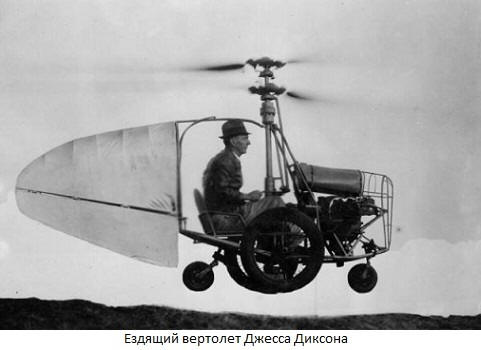 Машина Джесса Диксона из штата Алабама могла летать не только вперед, но и назад, поворачиваться и парить в воздухе. Это был ездящий вертолет. Двигатель в 40 л.с. позволял разгоняться до 160 км/ч.