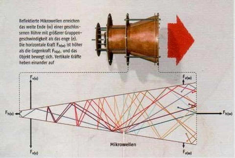 Теоретическое обоснование создания такого двигателя принадлежит британскому изобретателю Роджеру Шоеру. В 2006 году он построил экспериментальную модель. Тягу в 16 мн. (миллиньютон) создавали микроволны, колеблющиеся вокруг вакуумного контейнера. Электрическую энергию, необходимую для создания микроволн генерировали солнечные батареи. Свою машину изобретатель назвал EmDrive.