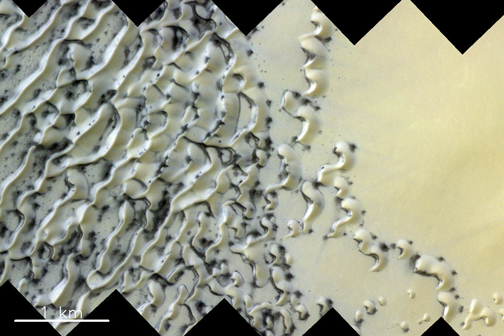Ученые ESA сообщили, марсианские дюны имеют различные формы, дающие представление о преимущественном направлении ветра. Если в течение длительного времени за ними наблюдать, то можно выяснить, как донные отложения распространяются по планете.