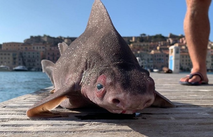 На итальянском острове Эльба рыбаки поймали необычное животное, похожее на акулу с мордой свиньи. Об этом сообщает Daily Mirror.