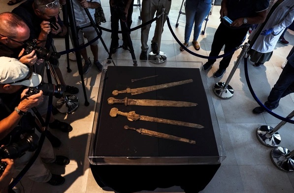 Он добавил: «Это уникальная капсула времени, в которой хранятся фрагменты свитков, монеты времен еврейского восстания, кожаные сандалии, а теперь даже мечи в ножнах, острые, как будто их спрятали только сегодня».