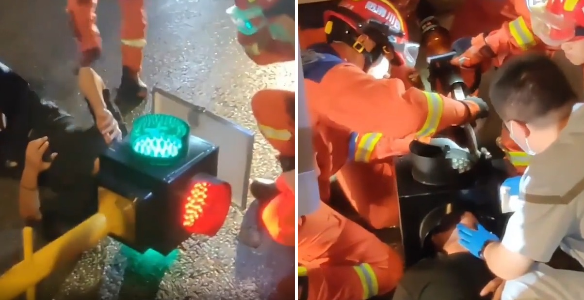 В Китае мужчина застрял головой в светофоре после столкновения на электросамокате