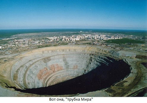 Возле трубки, получившей с легкой руки геологов наименование «Мир» возник поселок Мирный, впоследствии ставший городом и центром советской алмазодобывающей промышленности.