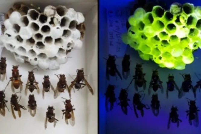 Гнезда азиатских ос светятся под ультрафиолетовым светом