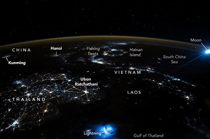 На фотографии также видна светящаяся сеть искусственного света, исходящая из Таиланда. Другие известные источники светового загрязнения на снимке излучаются из Вьетнама и острова Хайнань, самого южного региона Китая, хотя эти источники света в значительной степени скрыты облаками.