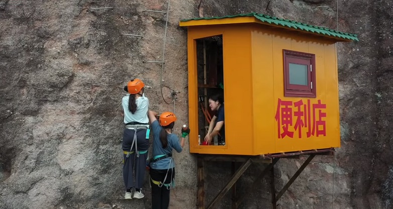 Небольшой деревянный магазин расположен на склоне вертикальной стены утеса, на высоте 120 метров над землей. В нем может разместиться только один человек. Когда приходит время пополнять запасы, сотрудники используют веревку, чтобы доставать припасы с земли.