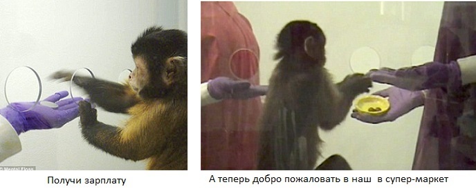 И вот тут экспериментаторы сделали революционный шаг: вместо товара стали выдавать капуцинам «зарплату» - жестяные жетоны. Ребята очень переживали, догадаются ли мартышки, что пластиковые карточки – это тот же банан, то же яблоко, та же шоколадка? Мартышки догадались. И прямо на глазах стали «очеловечиваться», приобретая все свойственные людям стремления и пороки.