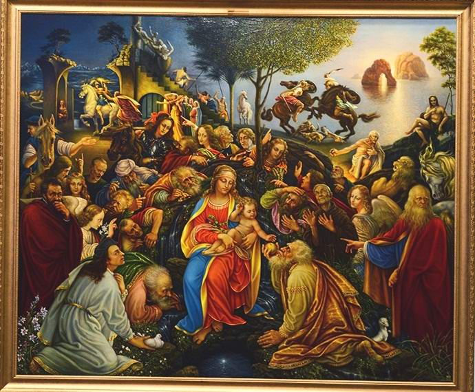 Константин Дверин рисовал это полотно четыре месяца, добавив в композицию множество новых деталей. Так, перед Пресвятой Девой теперь находится родник, в котором сияет Вифлеемская звезда, а саму Богородицу с ребенком окружает весьма разнообразная толпа, в которой, помимо паломников и юного да Винчи, можно разглядеть ангелов, животных, художников Микеланджело, Рафаэля и Боттичелли, а также персонажей, чья внешность была частично позаимствована у близких друзей Дверина.